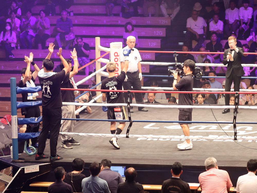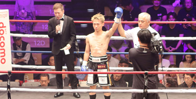改めて勝ち名乗りを受け、リング中央で拳を高く掲げられる。