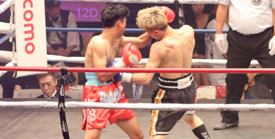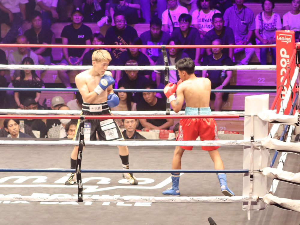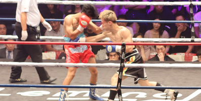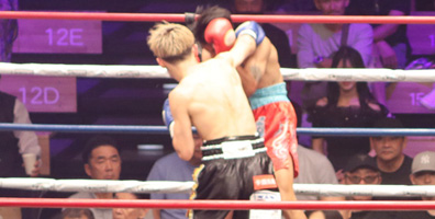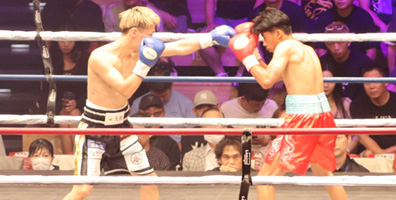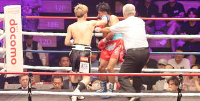 第1R。序盤からタイミング良くジャブを放ち、距離を図るゴウ。