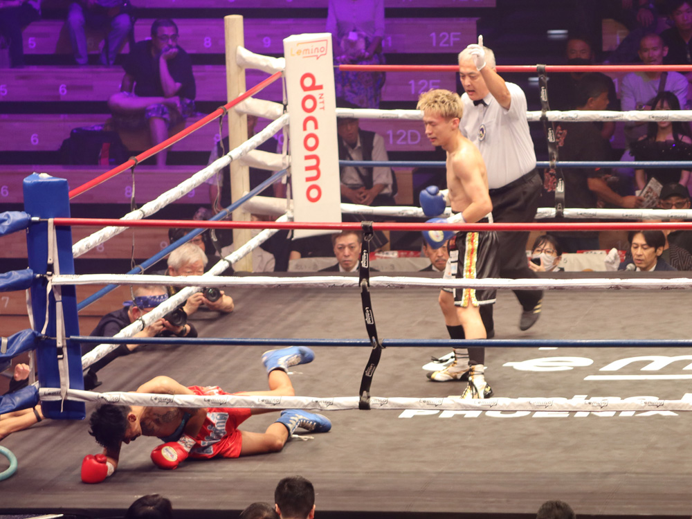 大きくのけぞりダウンする相手選手に、レフェリーが駆け寄る。