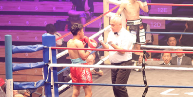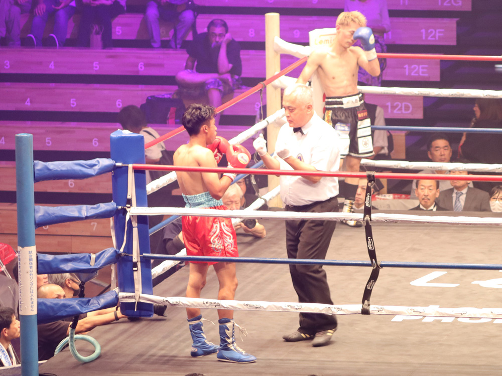 試合開始直前、対戦相手のターサーイ選手とリング中央で。
